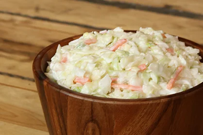 De-cored shredded cabbage and carrots mixed with a mayonnaise, salad dressing base with no added preservatives.