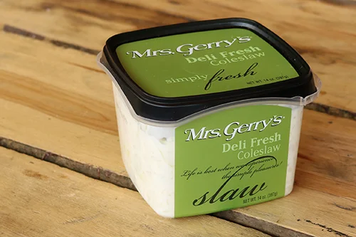 De-cored shredded cabbage and carrots mixed with a mayonnaise, salad dressing base with no added preservatives.