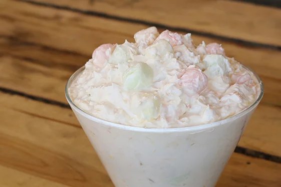 Shredded coconut, pineapple, colorful mini marshmallows, creamy vanilla pudding, and fluffy whipped topping are folded together to create this delicious tropical-inspired dessert.