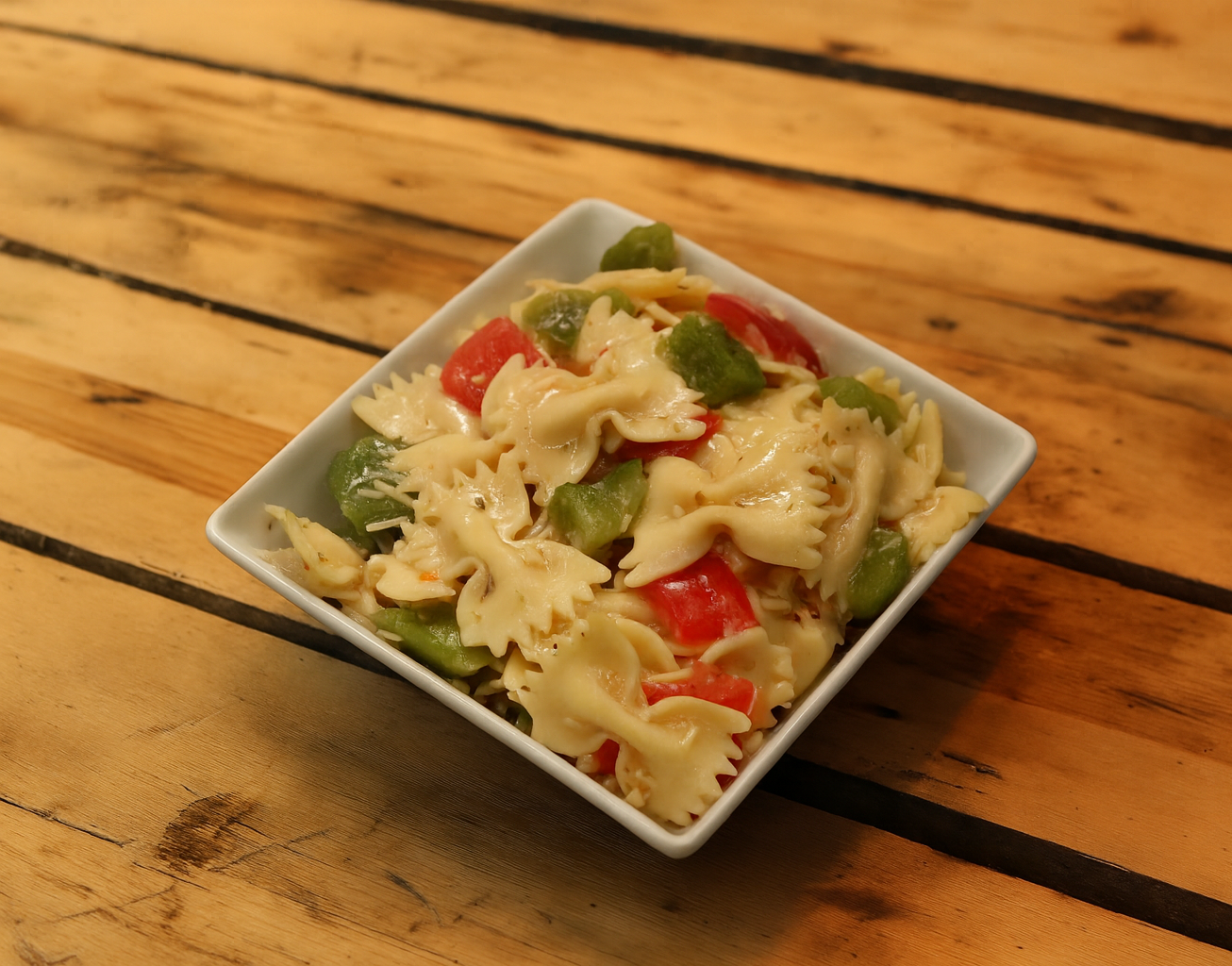 Bow pasta, green and red bell peppers, and onion in a light Italian vinaigrette with fresh Parmesan cheese.