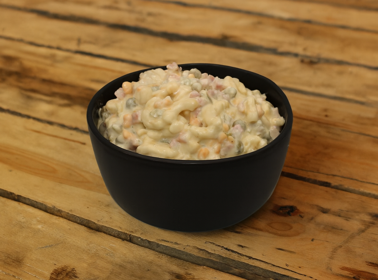 Elbow macaroni, cooked ham, Cheddar cheese combined with a creamy salad dressing base.