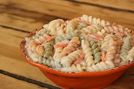 Al dente rainbow rotini pasta, fresh shredded carrots, onions, and green bell peppers tossed in a refreshingly sweet and creamy mayonnaise dressing.